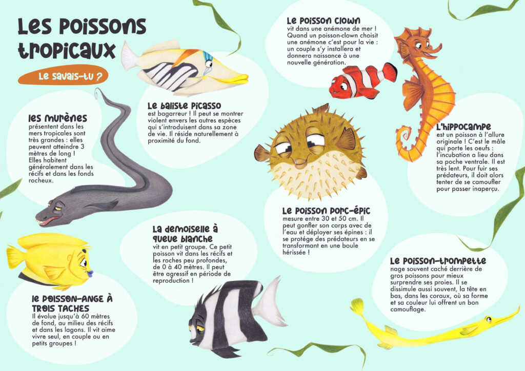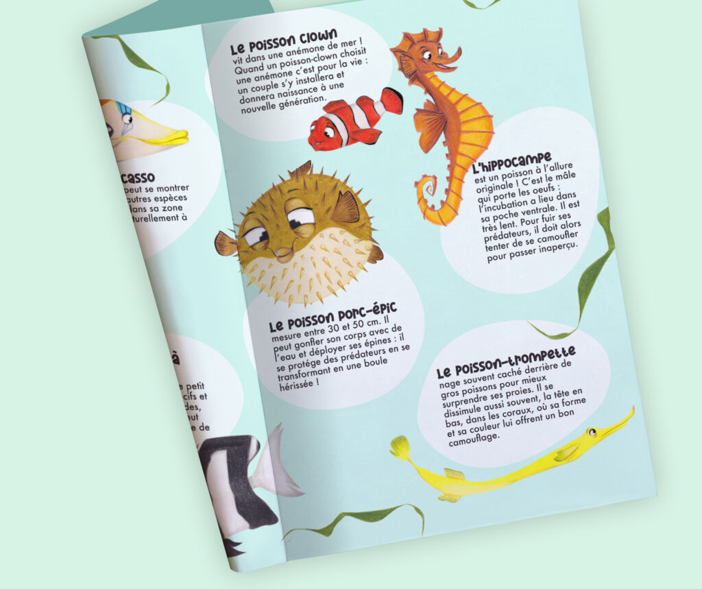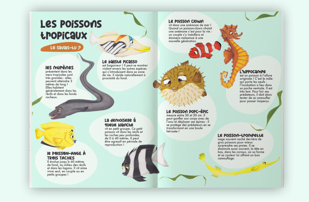 Cette illustration est une invitation à explorer les fonds marins, tout en découvrant les enjeux cruciaux de la préservation des océans et de la vie marine.