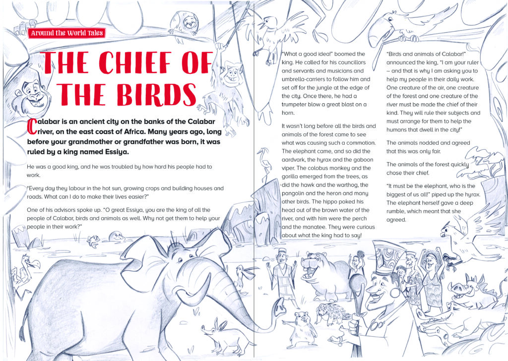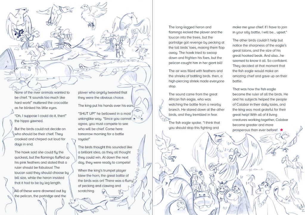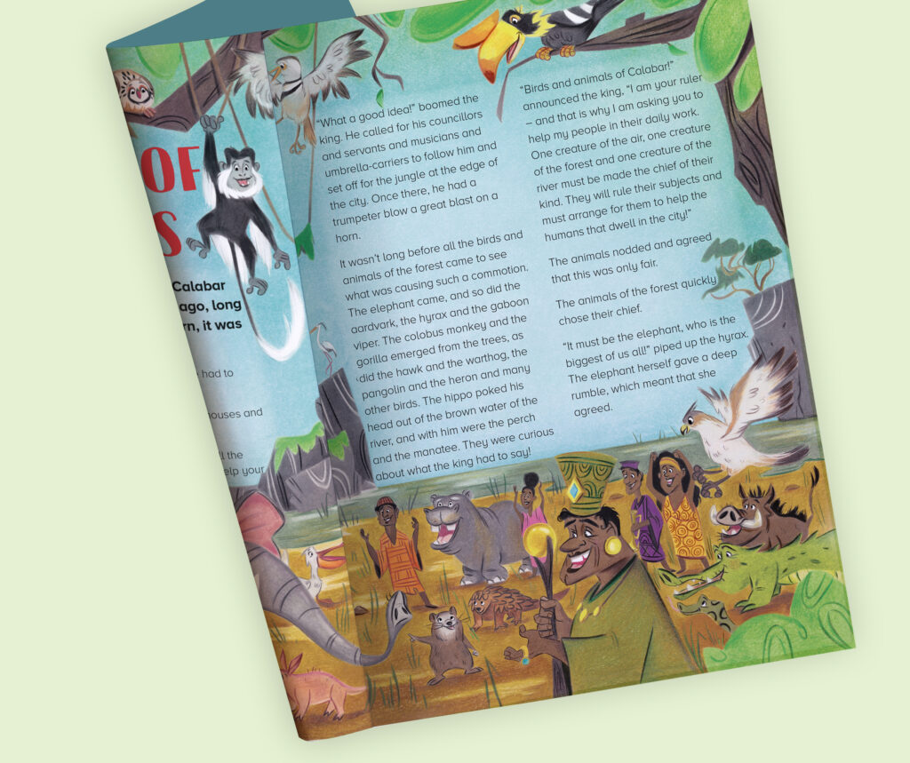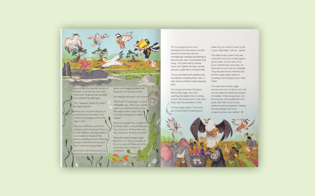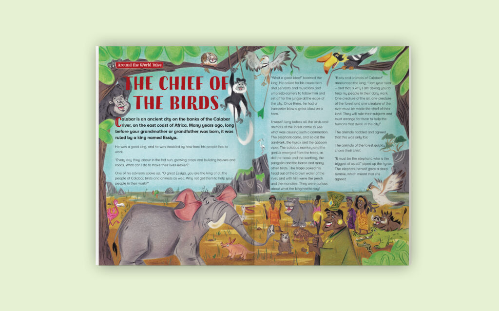 I had the pleasure of illustrating a short story titled « The Chief of the Birds » for Storytime Magazine. This African tale takes readers on a journey into a world filled with savanna animals. Through my illustrations, I aimed to capture the magic and adventure of the story while providing young readers with a visually rich and immersive experience.
