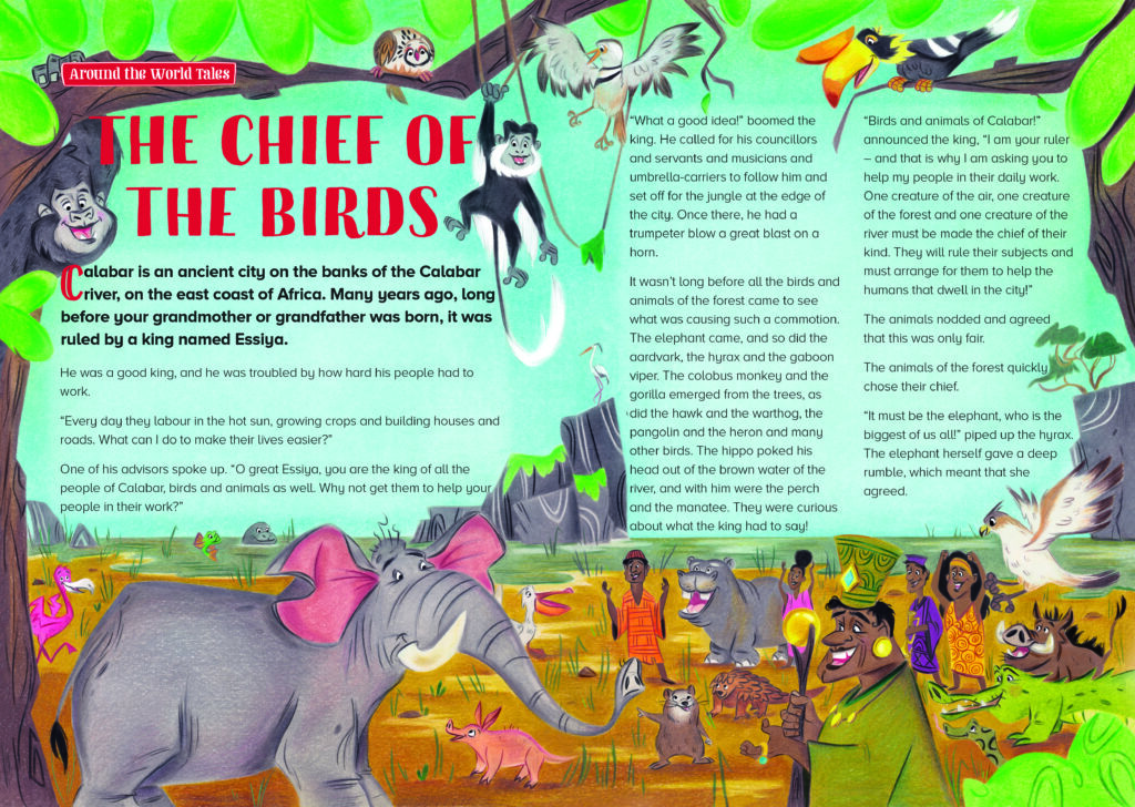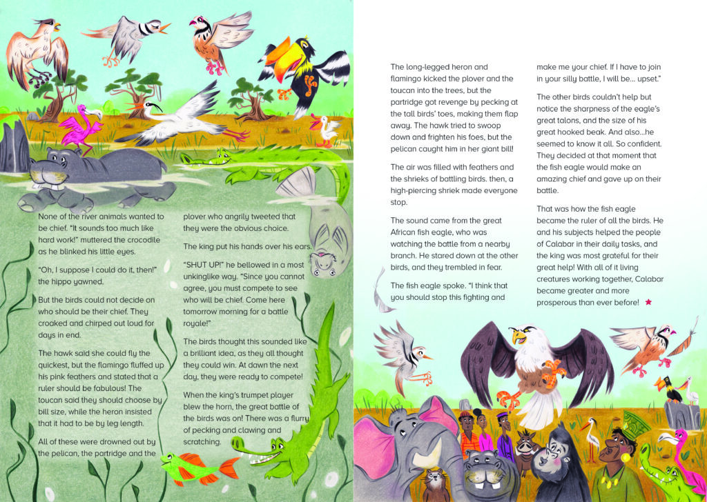 J’ai eu le plaisir d’illustrer une courte histoire intitulée « Le chef des oiseaux » pour le magazine Story Time Magazine. Ce conte africain transporte les lecteurs dans un monde remplis d’animaux de la savane. À travers mes illustrations, j’ai cherché à capturer la magie et l’aventure qui caractérisent ce récit, tout en offrant aux jeunes lecteurs une expérience visuelle enrichissante et immersive.