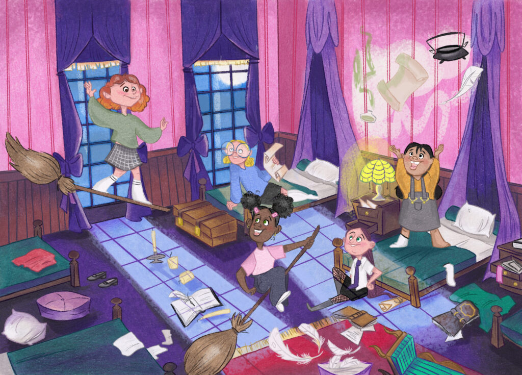 Voici un projet en cours que je développe pour enrichir mon univers narratif jeunesse. Il s’agit d’une histoire fantastique destinée aux lecteurs pré-ados, centrée sur la vie d’un pensionnat de magie, où les héroines apprennent à maîtriser leurs pouvoirs, explorent des matières étranges et vivent des aventures, rythmées par une enquête, des frissons, de la magie et beaucoup de rire et d’amitié.